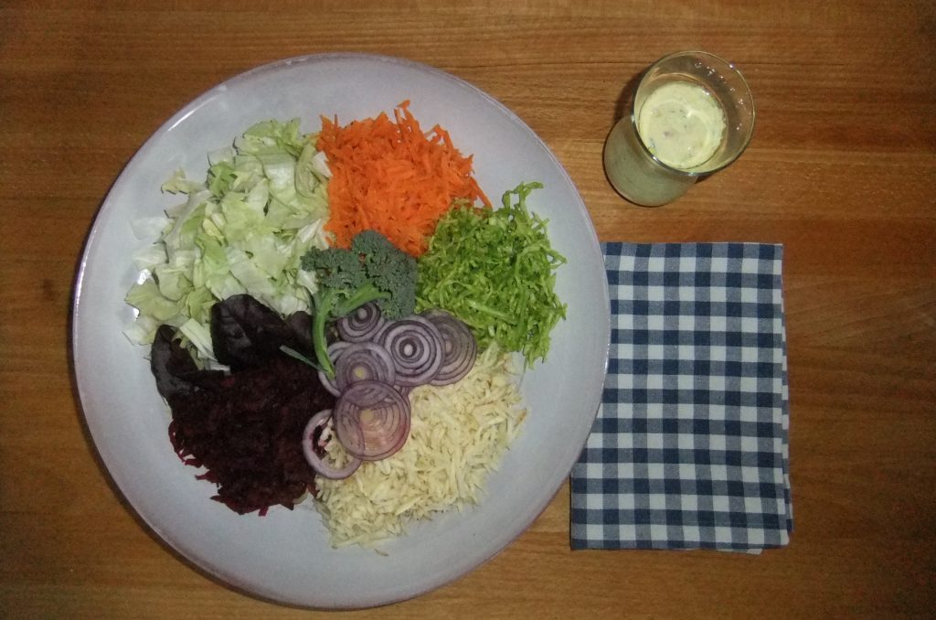 Frischkost ist der Salatteller. Da viele Personen, die sich um gesunde Ernährung kümmern, Vegetarier sind, ist es wichtig, verschiedene Salate und Gemüse zu kombinieren. Als Grundsatz gilt: zwei Pflanzen die über der Erde gewachsen sind und zwei unter der Erde gewachsene.