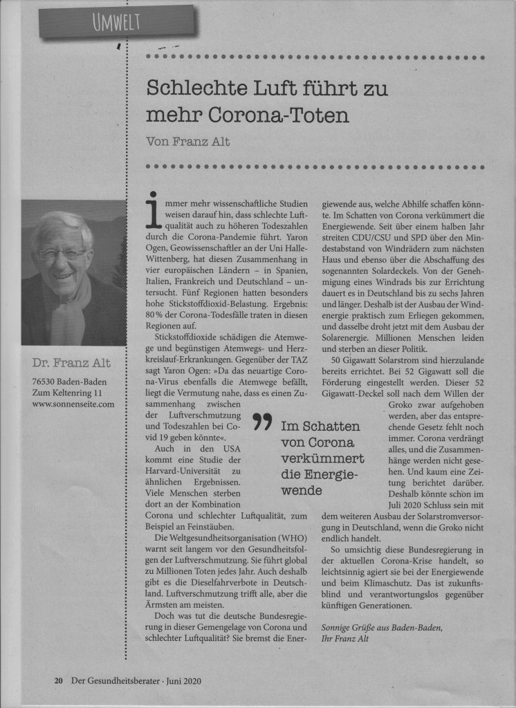 Natürlich gibt es auch zum Thema Covid-19 verschiedene Sichtweisen: Franz Alt betrachtet das Thema aus Sicht der Umweltbelastung.